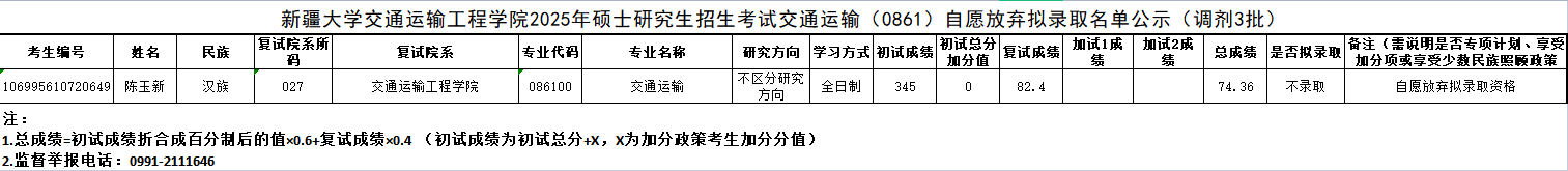 bwin中国官网2025年硕士研究生招生考试交通运输(0861)自愿放弃拟录取名单公示(调剂3批)