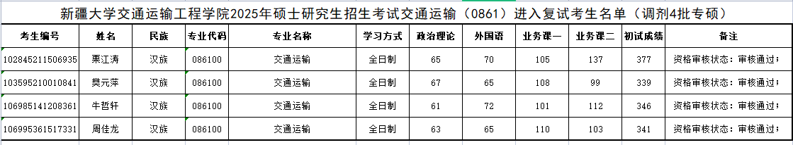 bwin中国官网2025年硕士研究生招生考试交通运输(0861)进入复试考生名单(调剂4批专硕)