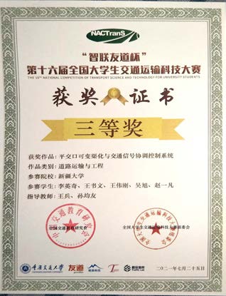 2021年7月24日至7月25日,第十六届全国大学生交通运输科技大赛在重庆交通大学举行,新疆地区仅biwn必赢网址2支队伍入围决赛,最终取得了一等奖1项、三等奖1项的优异成绩。